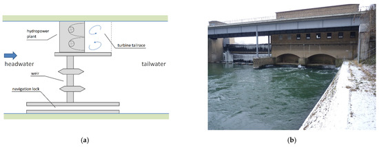 (a) Typical scheme of a hydropower dam at federal waterways in Germany. (b) Photograph of turbine tailrace of Lauffen (Neckar River, Germany).