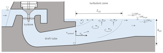 Schematic longitudinal section of the turbulent zone in a tailrace downstream of a vertically mounted Kaplan turbine with elbow draft tube; length of the turbulent zone; = vertical velocity; bulk mean velocity at draft tube exit section; tailwater levels , with 30 and 330 days of nonexceedance and at design discharge of HPP; water depth at draft tube exit section.