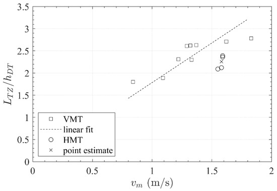 Normalized length of turbulent zone , as recorded from site inspections, for various bulk velocities at the draft tube exit section for horizontally mounted turbines (HMT) and vertically mounted turbines (VMT). Linear fit from Equation (2) with for VMT and point estimate at with for HMT.