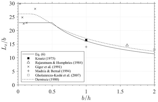 We use Equation (6) to determine the propagation length of a jet emerged from fishway slots with arbitrary aspect ratios . In Figure 5, the half-length of turbulent rectangular surface jets , where velocities on the centerline axis are half the initial velocity, , are calculated for typical aspect ratios of fishway entrances and compared to results from physical or numerical simulations [32,39,40,41,42]. Additionally, a function based on the point-source concept for the half-length is plotted [43]. The comparison yields a good agreement, but with a tendency of underestimation.