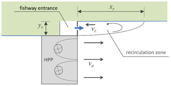 - The bankside fishway entrance should be located as close as possible to the obstruction, which, in the case of HPPs, is the draft tube exit section [4,10,14].