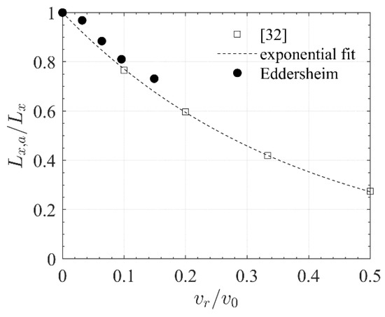 Reduction of the normalized propagation length of turbulent jets in reverse flows for velocity ratios as obtained from [32]. Normalization with propagation length without reverse flow. Approximation with an exponential fit (Equation (9)). Comparison with results from 3D-hydrodynamical simulations in the tailrace of Eddersheim Dam.