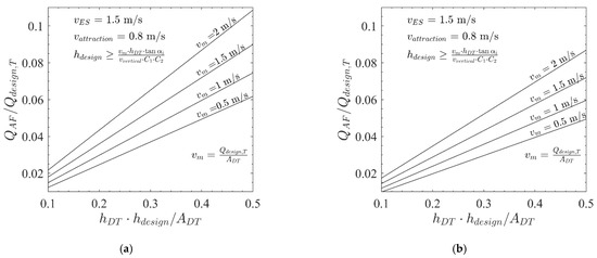 Attraction discharge normalized by design discharge of the adjacent turbine at hydropower plant for a velocity at entrance slot and a form factor determined using Equations (10)–(14) for hydraulic conditions at (a) for vertically mounted Kaplan turbines and (b) for horizontally mounted Kaplan turbines; minimum attraction velocity; = downstream water depth at the entrance slot; water depth at draft tube exit section; = area of the draft tube exit section.