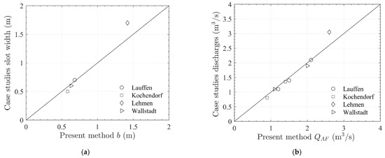 Comparison of the results of the present methods and case study results for (a) slot width and (b) attraction discharge . Where available discharges are compared for three different hydraulic conditions as given in Table 3.