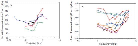- Ladich, F.; Fay, R.R. Auditory Evoked Potential Audiometry in Fish. Rev. Fish Biol. Fish. 2013, 23, 317–364. [Google Scholar] [CrossRef]