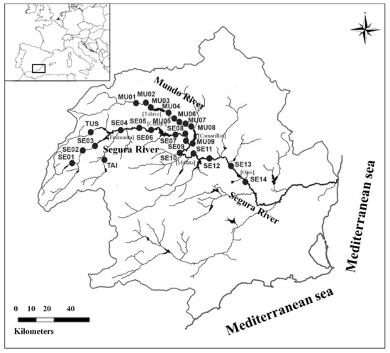Study area. Location of the Segura River basin in the southeast of the Iberian Peninsula. Sampling sites are marked (●): TAI (Taibilla River), TUS (Tus River), MU (Mundo River) and SE (Segura River). Names of large reservoirs are between parentheses [].