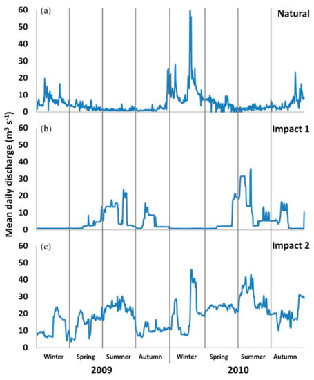 Flow variation (mean daily discharge; m3 s−1) at three representative fluvial sectors in the study area. Repre-sentative flow regimes were measured at three gauging stations: (a) Natural flow regime at the upper part of the Mundo River, (b) Impact 1 just downstream of the Cenajo reservoir, and (c) Impact 2 downstream of the La Mulata dam (see location in Figure 1). Flow discharge data were obtained from the Segura Hydrographic Confederation.