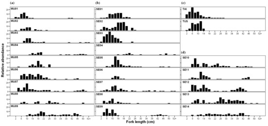 Size distribution (2 cm fork length (FL) groups) of L. sclateri at sampling site. Plot distribution: (a) Mundo River (MU) sampling sites, (b) sampling sites placed from Segura (SE) riverbed to Mundo River confluence, (c) sampling sites at tributaries Tus and Taibilla (TAI) Rivers and (d) sampling sites from Segura–Mundo confluence to the latest downstream sampling site (SE14).