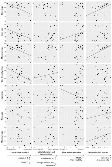 Relationship between environmental factors (longitudinal gradient, habitat alteration and fragmentation, flow regime alteration and non-native fish species) and L. sclateri population traits. Significant results (GLM p-value < 0.05) are represented with marked trend line on the plot. In x-axes, arrows pointing down indicate decrease in environmental variables (i.e., water temperature), and arrows pointing up indicate increase in environmental variables (i.e., altitude) and also increase in non-native abundance ratio.