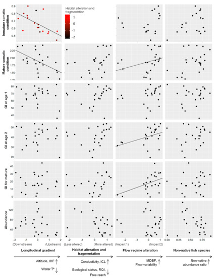 In addition to the interplay with the longitudinal gradient, the flow regime alteration (PC3) was linked to variability in the age range (age-related parameters, Table 3) and the growth index (GI) for mature fish and fish aged 2 years (growth, Table 3). An increase in the PC3 axis implied high flow variability and base flow (Impact 2, Figure 2c) and was associated with increased mean size and somatic condition of mature individuals, and GI at age 2 years and for mature individuals (flow regime axis, Figure 4). In contrast, a decrease in the PC3 axis implied low base flow and variability (Impact 1, Figure 2b) and was associated with a decreased age range (flow regime alteration axis, Figure 4).
