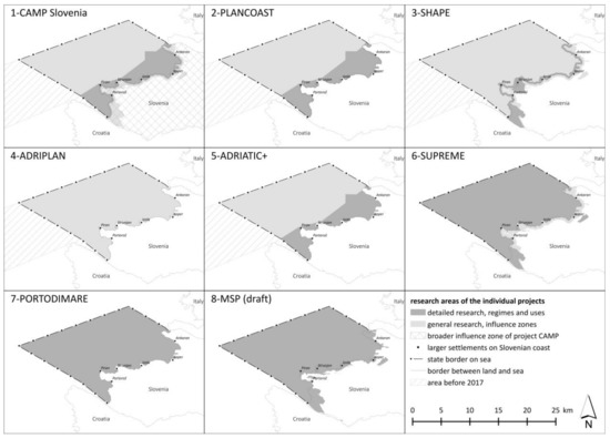 In the area of the Northern Adriatic, several international projects have taken place in recent decades, which have significantly contributed to the development of MSP and the preparation of the first generation of maritime spatial plans. It was found that there were seven key projects implemented in Slovenia, cofinanced from the EU and UNEP-MAP programs, namely the CAMP Slovenia, PLANCOAST, SHAPE, ADRIPLAN, ADRIATIC+, SUPREME, and PORTODIMARE projects. Unlike in other countries, in Slovenia the projects were always applied to the entire national sea and the coastal zone but focused on project-specific topics. This feature is also an advantage since all projects were implemented within the scope of the formal maritime spatial plan and in one case even beyond.
