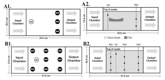 Schematics of the set-up for flow tank experiments with monitoring well (MW) and injection well (IW) locations. Note: Not drawn to scale. (A1) Aerial view of small flow tank. (A2) Cross-sectional view of small flow tank with clay lens and sampling locations at varying depths. (B1) Aerial view of large flow tank. (B2) Cross-sectional view of large flow tank with sampling locations at varying depths.