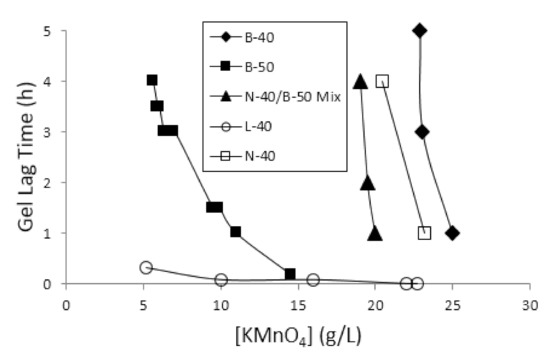 N-40/B-50 mix SRPGs exhibited gelation lag times at KMnO4 concentrations comparable to the N-40 and B-40 SRPGs. A 19.0 g/L N-40/B-50 mix SRPG solution achieved gelation in ~4 h, but no gel was formed at a [KMnO4] of 18.0 g/L.