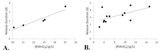 Release duration was also monitored during column tests. It should be noted that the release duration included measurements of [MnO4−] below the detectable limit. When below this threshold, the presence of MnO4− was confirmed by the purple discoloration of the effluent. The B-40 SRPGs demonstrated release durations ranging from 1.3 to 3.6 d (Ra = 2.3 d) with an average release duration of 2.1 d (SD = 0.9 d). Release durations of the B-50 SRPGs were significantly greater than those from the B-40 SRPG solutions (t(15) = 2.16, p = 0.05). B-50 SRPG release durations ranged from 1.7 to 4.7 d (Ra = 3.0 d) with an average release duration of 3.2 d (SD = 0.95 d). Furthermore, a significant linear trend between [KMnO4] and release duration was observed in both the B-40 SRPGs (r(3) = 0.95, p = 0.01) and the B-50 SRPGs (r(10) = 0.58, p = 0.05) as shown in Figure 4.