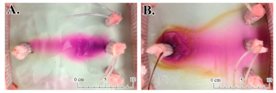 As solution can diffuse into and counter-diffuse from low-permeability units [9,10,11], part of this study focused on testing the feasibility of producing a secondary slow-release system in situ with the injection of SRPG solution. It was expected that as a gel, the SRPG should be able to offer more lateral area for diffusion of MnO4− into a clay matrix compared to a pure KMnO4 solution mainly due to the higher viscosity of the gel. During counter-diffusion, this should allow the SRPG to behave as a long-term source of MnO4− to target DNAPLs. Solpuker et al. [11] investigated the transport of KMnO4 mixed with ultra-dense silicate solutions in porous media containing low-permeability layers and lenses. Even in the silicate matrix, MnO4− was capable of diffusing into a low-permeability clay lens. In the first 2 d, the MnO4− infiltrated the clay where it remained emplaced for ~11 d. It took ~1 month for the MnO4− to be depleted from the tank. DNAPLs often gather near low-permeability units, and this tendency could be exploited to extend the release duration of the oxidant in the target zone.