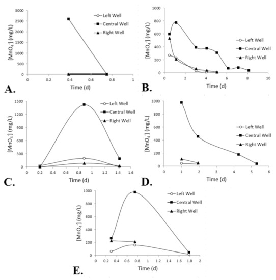 Mean measurements of MnO4− concentration over time from 26 g/L (A) KMnO4 solution in all-porous media, (B) B-40 SRPG in all-porous media, (C) KMnO4 solution in porous media with a clay lens, (D) B-40 SRPG in porous media with a clay lens, and (E) B-40 SRPG in porous media with a fractured clay lens. The terms “left” and “right” were used to differentiate the exterior wells based on the direction of the injection well facing the monitoring wells.