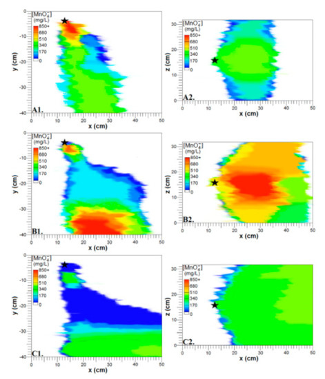 About 54 h after injection, high concentrations of MnO4− descended to the bottom of the tank and relatively high concentrations remained near the injection point (Figure 7B1). Meanwhile, relatively low concentrations occupied the intermediate depths. Lateral spreading of the oxidant produced higher [MnO4−] values at the exterior monitoring wells which is indicative of a capability to disperse much farther laterally than the tank permitted (Figure 7B2).