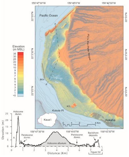 The Kekaha-Mānā Plain is a crescentic, 24 km long, northwest-southeast trending coastal plain (Figure 1). Land northwest of Kekaha was traditionally described as mānā (arid) [], and this nomenclature for the study area is used herein. The Mānā Plain is underlain by a wave-cut platform and bounded by abandoned sea cliffs (pali) formed in 5.1–4.3 Ma old layered tholeiitic lavas of the Waimea Canyon volcanic series’ Nā Pali formation [,]. Landscape evolution modelling suggests the cliffs were created by wave erosion in the 2 Ma period following the cessation of shield-building volcanism and reactivated during the last interglacial (130–120 ka) highstand [].
