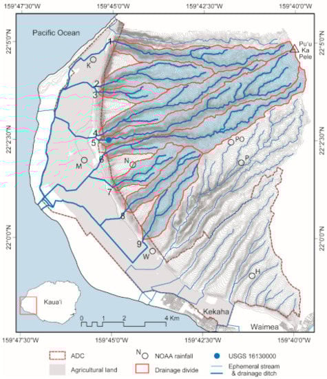 Storm runoff flowpaths to Kinikini and Dry Ditch (heavy blue lines) and other drainage ditch system outlets (light blue lines), and HEC-HMS basins and stream networks (see Table 1 for basin names, 1–9). Contour interval 10 m (cf. Figure 1). The locations of the USGS gauging station on Nahomalu Steam (USGS 16,130,000), and the NOAA atlas rainfall stations on Pu‘u Ka Pele Slope and the Mānā Plain from which point precipitation frequency estimates were derived are also shown: H, Hukipo; N, Nui Ridge; P, Puehu Ridge; PO, Puʻu ʻŌpae; K, Kolo; M, Mānā; W, Waiawa. The boundary of the State of Hawai‘i Agribusiness Development Corporation’s (ADC) land facilitates comparison with Figure 2 and Figure 4.