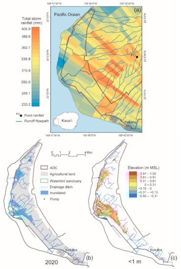 (a) South Kaua‘i (HKI), NEXRAD Level-III total storm rainfall 16–17 March 2020, runoff flowpaths, and location of the Puʻu ʻŌpae rain gauge; PO. (b) Extent of inundation following the March 2020 storm extracted from Landsat 8 OLI/TIRS scene LC80660452020088LGN00 acquired on 28 March 2020. (c) Location and elevation of low-lying land (<1 m MSL) on the Mānā Plain that is and likely will become susceptible to transient, storm event-based flooding by the end of this century. N.B. The NOAA Coastal Services Center’s 3 m DEM (see Figure 1) is hydro-flattened and water elevations in the waterbird sanctuary and drainage ditch system are expressed as ≤−0.5 m MSL. To facilitate conversion to U.S. customary units specified intermediate elevations are rounded to 2 decimal places. The boundary of the State of Hawai‘i Agribusiness Development Corporation’s (ADC) land facilitates comparison with Figure 2 and Figure 3.