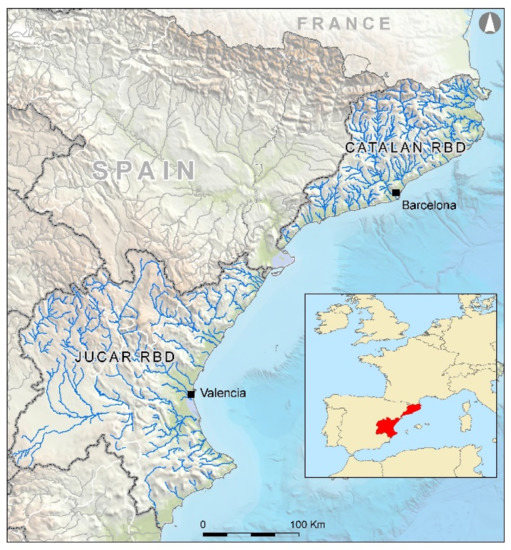 Location of the Catalan and Júcar river basin districts (RBDs).