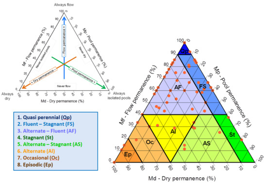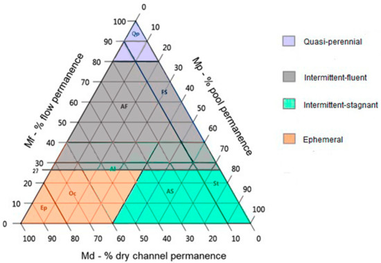 However, as stated above, rainfall-runoff models can overestimate low flows (close to zero flows), and cannot reliably detect zero flows or whether riverbeds are constituted by disconnected pools or completely dry [8,10,37]. Therefore, an additional method to better classify TRs, which especially considers low and zero flow regimes, and changes in connected-disconnected pool patterns was required, especially because pools are ecologically unique and have high biodiversity values [45]. The TREHS software allows the classification of TRs taking into account three main axes (aquatic phases): flow permanence (Mf), disconnected pools permanence (Mp), and dry river permanence (Md); in a FPD (flow-pools-dry) plot (Figure 2), which aims at describing the main hydrological regime controls on biological communities [37]. TREHS proposes a classification of the TR regime that takes into account these three axes for a total of nine different “aquatic phases regimes” (APRs) (Figure 2): perennial (P), permanently flowing; quasi-perennial (Qp), usually flowing; fluent-stagnant (FS), occasionally drying with disconnected pools; alternate-fluent (AF), usually flowing and stagnant at infrequent intervals; stagnant (St), usually with disconnected pools but never dry; alternate-stagnant (AF), usually with disconnected pools that occasionally dry; alternate (A), rotates between disconnected pools and dry aquatic phases; occasional (Oc), usually dry; and episodic (Ep), with long dry periods (almost never flowing). The APR classification was designed to: (i) be fully applicable from obtainable information, (ii) take into account the statistics of the three aquatic phases, (iii) be represented in a single graph, (iv) be conflict-free from the most usual terminologies, and (v) be defined from hydrological features assumed to have biological implications. Data for this classification can be collected from several sources: gauging stations, model simulations, interviews or surveys, in situ observations, and aerial or ground-level photographs for a significant period [37].