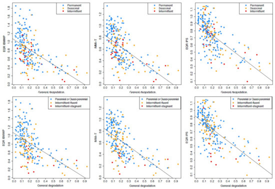 Largely, values of the three analyzed biological quality indices showed a good linear relationship with the general degradation gradient (Figure 3), which means they are WFD compliant [49]. Nevertheless, there was a certain dispersion of points around the regression line, due to some gaps in the response of the quality indices to the general degradation gradient. Preferably, all sites should be distributed as close as possible throughout the regression line, and gaps or values located far from the regression line need to be carefully analyzed in order to avoid misleading results due to an unsatisfactory adjustment of the index, or the inappropriate allocation to a particular river type, and/or the wrong reference values being used. Reviewing the relationship between each biological quality index and the general degradation gradient, we found differences when classifying TRs. When NFPR classification was applied (Figure 3), permanent and seasonal rivers were widely distributed around the regression line, and intermittent rivers were mainly located at the bottom of the regression line, even though quite a few are located above. Ephemeral rivers were not possible to plot, since general degradation values were not possible to assess due to lack of water to take biological and chemical data.