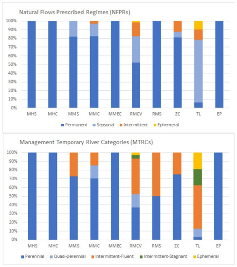 On the other hand, when TREHS was applied, six NRTs were subdivided into different APRs. Therefore, 27% of MMS water body types were classified as alternate-fluent, 15% of MMC as quasi-perennial, and 15% as alternate-fluent. RMCV, ZC, and TL river types showed a wide range of APRs within them. Over 60% of RMCV were classified as non-perennial, showing seven different APRs (quasi-perennial, alternate-fluent, fluent-stagnant, stagnant, alternate-stagnant, alternate, occasional, and episodic). Almost all TL water body types were classified as non-perennial (over 95%), whereas around 25% of ZC types showed alternate-fluent and fluent-stagnant APRs. RMS river type was divided into perennial and alternate-fluent APRs, whereas using NFPR type did not show differences according to natural river temporality.