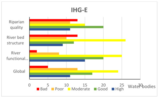 Number of river water bodies classified according to the Hydro-geomorphological quality index adapted to temporary rivers, IHG-E [50]. The global IHG-E results, and the three main quality elements: the river functional quality, river bed structure, and the riparian quality, are shown. The IHG-E index was applied to 70 ephemeral river water bodies in the Júcar RBD.