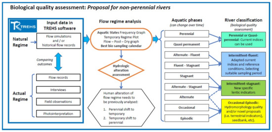 According to the results stated above, we developed a common methodology to better classify TRs, in order to assess their ecological status for management purposes. Flow regime temporality and cease of flow are largely neglected in classifying river types, although, as widely demonstrated, they are relevant for determining the presence or survival of certain biological species and the reliability when applying biological quality indices [45,52,53]. Misleading results can be obtained if TRs are not considered and classified correctly, paying special attention in intermittent-stagnant and ephemeral watercourses, and shifts among aquatic phases. Therefore, according to the experience gained from the Catalan and Júcar RBDs by the LIFE + TRivers Project, we propose a flowchart to better classify TRs and correctly assess their biological quality (Figure 6):