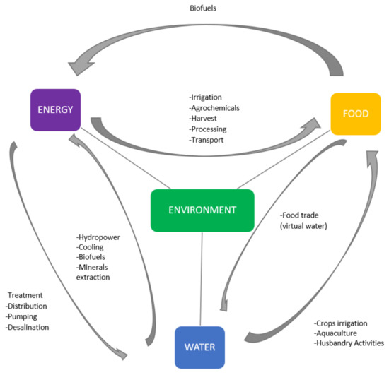 Schematic representation of the interdependencies between water, food, energy, and environment. Source: [25].