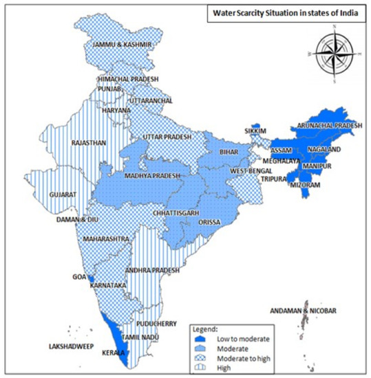 Furthermore, India is among the water-scarce economies experiencing a highly skewed distribution of water availability in space and time, uncertainties in supplies, and frequent and intense occurrence of hydro-meteorological disasters like floods and droughts. Katyaini and Barua (2016) have drawn on four fundamental approaches, namely, the human water requirement, water resource vulnerability, the incorporation of environmental water needs, lifecycle assessment, and water footprint to map the level of water scarcity in the country [30]. The findings indicate that Punjab, Haryana, Rajasthan, and Gujarat in the north-west, and Andhra Pradesh and Tamil Nadu in the south, experience high water scarcity. There are parts of India which face moderate to high, moderate, and low to moderate water scarcity (Figure 2).