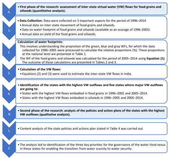With this background, the study aims to explore the question of how the VW flows concept, which is at the heart of the water–food nexus, can play a role in governing the transition towards water security in water-scarce economies. The analysis has been carried out in the context of India. There are two main foci of the analysis: first, to identify the states in India with the highest VW outflows embodied in major agricultural products, such as food grains and oilseeds, and which states these VW outflows go to. Second, there is an analysis of the governance of the water–food nexus in these states with the highest VW outflows. This analysis is intended to identify the priorities for the states to transition from water scarcity to water security. This study is an extension of Katyaini and Barua [30,31] and Katyaini, Barua, and Duarte [32]. The identification of the states with the highest VW outflows has been discussed in Katyaini and Barua [31] and Katyaini, Barua, and Duarte [32]. The two important extensions covered in this paper are the identification of the five main states to which the highest VW outflows go to, embodied in oilseeds. Second, the identification of the key priorities for water–food governance in the states with the highest VW outflows embedded in food grains and oilseeds based on the qualitative analysis of the state-level policies and action plans.