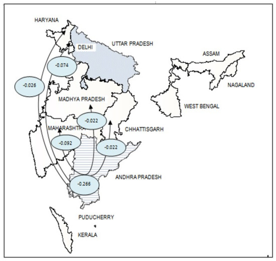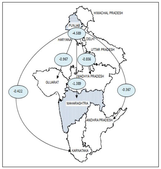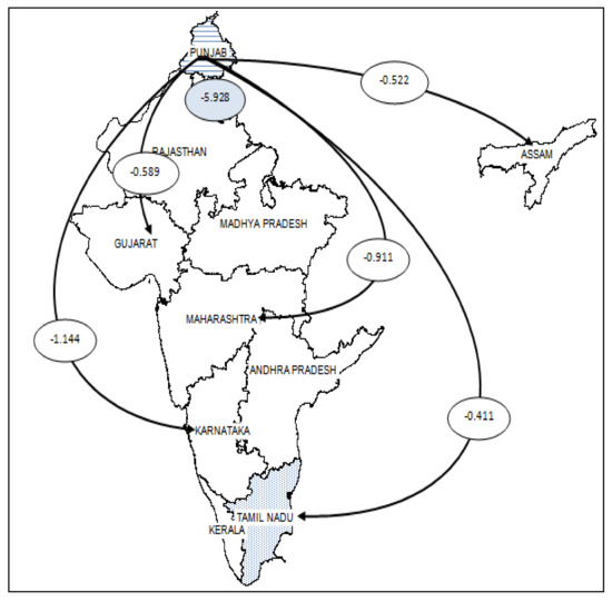 From 1996–2005, Punjab had the highest net VW outflows, i.e., −4.589 TL/year for food grains (Figure 4). These VW flows from highly water-scarce Punjab are to other highly water-scarce states (Gujarat and Andhra Pradesh), moderate to highly water-scarce states (Maharashtra and Karnataka), and the moderately water-scarce state of Madhya Pradesh. From 2005–2014, Punjab continued to have the highest VW outflows. The outflows increased to −5.928 PL/year, which is equivalent to −5928 TL/year [31]. The VW flows from Punjab to Maharashtra, Gujarat, and Karnataka continued from 2005–2014, with the addition of Tamil Nadu and Assam as the two other states (Figure 5). Tamil Nadu is highly water scarce like Punjab, and Assam has is low to moderate water scarcity. It can be inferred from these VW outflows of Punjab that water scarcity is not being distributed throughout the states.