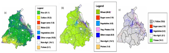 Cropping pattern of Punjab in (a) Kharif, (b) Rabi, and (c) summer. Values in brackets represent the percentage of area under each crop with respect to net sown area. Source: [49].