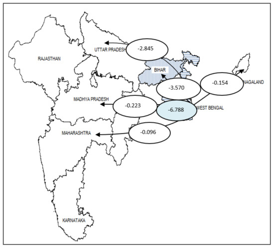 In the period of 2005–2014, West Bengal emerged as the state with the highest net VW outflows (6.788 TL/year) for oilseeds (Figure 9). Mustard and groundnut form a considerably large part of these VW flows as these are the main oilseeds produced in the state. The major VW outflows from West Bengal are to the other moderate to highly water-scarce states of Uttar Pradesh and Maharashtra, moderately water-scarce Bihar and Madhya Pradesh, and low to moderately water-scarce Nagaland (Figure 2 and Figure 9).