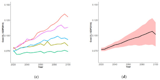 Figure 1b,d shows the mean evolution over time for both output variables of interest (expressed in % of the Gross Domestic Product with reference year of 2014 (https://www.statista.com/statistics/268750/global-gross-domestic-product-gdp/, accessed on 1 July 2020)) together with the uncertainty band whose lower and upper bounds are respectively defined at +/− one standard deviation (red envelope). Both EAD and AC are projected to increase globally over the 21st century, with the mean EAD value reaching 0.7% of the 2014 global GDP and 0.1% for the mean AC value. Uncertainty increases over time as well, as indicated by the increase in the width of the uncertainty band, until reaching >+/−80% of the mean value for EAD, and ~+/−15% for AC by 2100. We note a small decrease of AC in 2100 that may be related to the higher variability of inter-annual AC fluctuations around its temporal mean as illustrated by five random realizations in Figure 1a (contrary to EAD, which presents a smoother time evolution; see Figure 1c): confirming this tendency would however require projections beyond 2100, which is hardly feasible given the current status of data availability.
