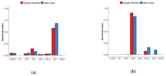 The same procedure is now conducted by considering a situation where, for each uncertainty, a scenario has been assigned a higher likelihood than others (see Table 2 and Table 3). Figure 2a (blue barplots) shows that, accounting for the scenario occurrence likelihood only moderately modifies the sensitivity indices except for SSP (respectively RCP) with an increase (respectively decrease) of ~10% for EAD. These changes remain of moderate order of magnitude, which shows that the tendencies in the sensitivity evolution (highlighted in Section 3.1) remain robust even when differentiating likelihoods. The impact for AC is more noticeable: SSP influence reaches (approximately) the one of RSLR by 2100.