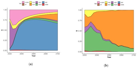 The influence of the assumed likelihood weight values were tested by setting the conditional probability values (of Table 3) below 10% to zero. On the one hand, the RCP2.6-SSP2, RCP2.6-SSP3, RCP2.6-SSP5, and RCP4.5-SSP5 combinations became unlikely and were not accounted for in the sampling procedure. On the other hand, the likelihood weight values of RCP4.5-SSP2, RCP85-SSP2, and RCP8.5-SSP5 increased (up to 13.5%). Compared to Figure 4, these changes only lead to minor differences (see Supplementary Materials: Section 2.1) in the value of the sensitivity measures (no more than 5%). The time evolution of the sensitivity measure appears to be the same as well as the importance ranking: our conclusions can thus be considered little affected by assumed changes in likelihood weights and by the removal of the afore-mentioned RCP-SSP combinations.