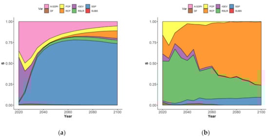 Figure 4 shows that the time evolution of the respective modelling uncertainties follows the same tendency as for Figure 3 (i.e., the shape of the trend over time remains similar). Note that to ease the interpretation and the comparison with Figure 3, the vertical axis of Figure 4 has been scaled to [0, 1], because the sum of all indices reaches ~110–115% (see Section 2.2). All unscaled results are provided in Supplementary Materials: Section 3.