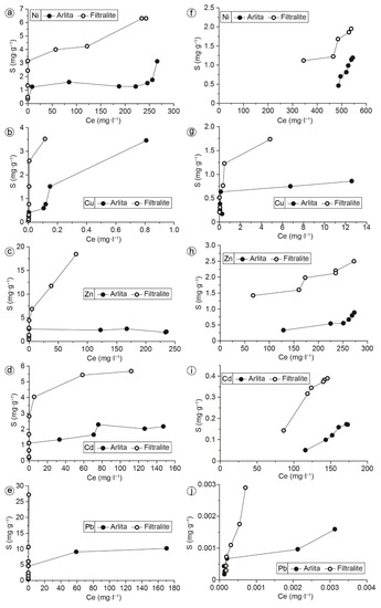 Figure 2 shows the results obtained from the batch experiments. The general trend for all the contaminants shows that Filtralite always presented a higher removal capacity than Arlita, although this behavior changed for the different contaminants. For instance, Filtralite stabilized at a maximum equilibrium concentration of 234.34 mg·L−1 and 100.00 mg·L−1 for Ni (Figure 2a) and Cd (Figure 2d), respectively, and presented a retention capacity of 6.29 mg·g−1 for Ni and 5.43 mg·g−1 for Cd. We considered that the maximum removal capacity was obtained the first time that the slope of the batch test between two consecutive points was smaller than 3%. However, the removal capacity for Cu (Figure 2c), Zn (Figure 2d), and Pb (Figure 2e) did not show stabilization with an increase in the metal concentration, which means that the material did not reach its maximal removal limit. In contrast, Arlita presented a stabilization in its removal capacity for four out of the five elements considered: Ni, Zn, Cd, and Pb at equilibrium concentrations of 84.61, 122.56, 33.47, and 170.70 mg·L−1, and a retention capacity of 1.59, 2.37, 1.33, and 10.13 mg·g−1, respectively. Arlita’s removal capacity for Cu increased with concentration and did not stabilize in the range of the tested concentrations. In the batch tests developed with solutions containing individual contaminants, the average removal capacities for Arlita and Filtralite were 76% and 90%, respectively, although the values varied across the different contaminants. For instance, removal capacities of Filtralite for Cu and Pb were higher than 97%. Removal capacity for Zn was 94% and that for Cd was 88%. These results are in agreement with other removal capacities achieved when contaminated waters containing heavy metals were treated with other materials such as vermiculite, kaolinite [64], bentonite, volcanic ash soil [65], or zeolites [66], among others.
