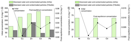 Results from the test that evaluated the reversibility process are collected graphically in Figure 3. The maximum concentrations of contaminants in experiments developed with contaminated particles and deionized water were 0.055 mg·L−1 and 0.05 mg·L−1 for bottles containing Arlita contaminated with Cd and Zn solutions, respectively (Figure 3a). Equilibrium concentrations when employing Filtralite were always lower than when using Arlita, independently of the aqueous initial solution, revealing that Filtrate is not only better for metal removal but also for fixing the contaminants, thereby not releasing them back to the water.