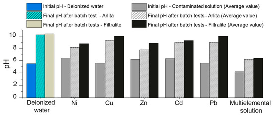 The pH values of the different contaminated initial solutions employed in the batch tests ranged from 4.2 to 6.4 (Figure 4). The tests developed with multielemental solutions presented the lowest initial pH values in comparison to the individual contaminated solutions. The pH values in water after the batch experiments were always higher than pH values in the initial water for all individually contaminated and multielemental solutions, and the increase was always higher for Filtralite than for Arlita.