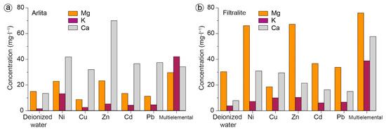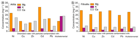 Similar results were also found in the case of the additional batch tests that employed the contaminated particles and deionized water (Figure 6). Mg, K, and Ca showed a similar trend, with final concentrations of 20.5, 2.4, and 12.2 mg·L−1 for Arlita (Figure 6a) and 23.7, 3.2, and 5.8 mg·L−1 for Filtralite, respectively (Figure 6b).