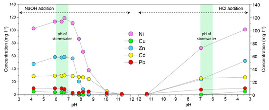 The pH influenced the heavy-metal removal by LWAs not only via the sorption reactions but also via oxide precipitation as a consequence of the pH increase. A final test was developed to evaluate the chemical precipitation mechanism and the effect of the precipitation in the contaminated solution; the pH of the multielemental solution (without the presence of LWA) was increased by adding NaOH (from 4.2 to 11.3), and it was later decreased by adding HCl (from 11.3 to 3.4). Solution samples were collected at each pH stage, and contaminant concentrations were evaluated (Figure 7). Results showed that the final concentration of contaminants directly depended on pH values, reaching the lowest concentrations with the highest pH. At the maximum pH (11.3), the concentration of contaminants in the aqueous solution was nearly 0. When the process was reversed and pH decreased from 11.3 to 3.4, the concentration of contaminants in the aqueous solution increased to nearly the initial concentration, which highlights the importance of the solution pH for heavy-metal removal. Within the pH range of stormwater, between 6 and 7 [62], the concentration of heavy metals achieved the maximum value for all the studied components (116.1 mg·L−1 for Ni, 8.2 mg·L−1 for Cu, 58.1 mg·L−1 for Zn, 29.7 mg·L−1 for Cd, and 8.8 mg·L−1 for Pb; Figure 7).