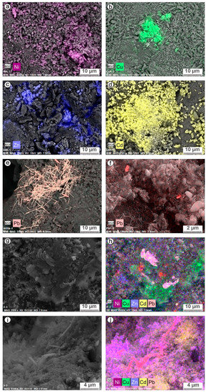 Field-emission scanning electron microscopy (FESEM) images and distribution map (mapping) of the different studied elements after batch experiments with the most concentrated solutions. Images show the forming precipitates on the particles from the batch tests containing solutions with individual contaminants (Arlita: (a–e); Filtralite: (f)) and with multielemental solutions (Arlita: (g,h); Filtralite: (i,j)).