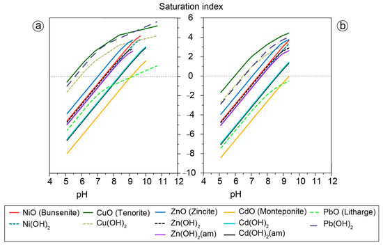 Alternatively, heavy-metal removal via chemical precipitation was simulated with the PHREEQC code as pH increased. In basic conditions, insoluble phases such as carbonates, oxides, and/or hydroxides of heavy metals precipitated and coprecipitated, consequently being removed from the contaminated solutions [68]. The geochemical modeling with PHREEQC calculated the saturation index of selected metal oxides and hydroxides that could potentially precipitate on the LWA surface as pH increased (Figure 8). In these calculations, we used the most concentrated aqueous contaminated solutions, and we calculated the saturation index of the following minerals, while crystalline and amorphous (am) metal oxides and hydroxides were also included: for cadmium, Monteponite-CdO, Cd(OH)2, and Cd(OH)2(am); for copper, Cuprite-Cu2O, Tenorite-CuO, and Cu(OH)2; for nickel, Bunsenite-NiO and Ni(OH)2; for zinc, Zincite-ZnO, Zn(OH)2, and Zn(OH)2(am); for lead, Litharge-PbO and Pb(OH)2. For the multielemental solution, Pb removal via precipitation of the insoluble PbSO4 was corrected by using the resulting water after anglesite (PbSO4) precipitation.