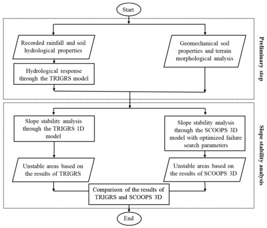 The methodology adopted in this work aims to compare the performance of a 3D model vs. a 1D model in the prediction of landslide areas as a result of an intense rainfall event. This comparison requires a hydrological analysis to be performed as a preliminary step. In this work, this is done through the hydrological module of TRIGRS program, which uses a linearization of the 1D vertical infiltration Richards equation (see Section 2.1). Taking as input the pressure head fields of the hydrological analysis, the geomechanical analysis is performed using the infinite slope model implemented within TRIGRS (see Section 2.2) and the SCOOPS 3D model (see Section 2.3). While using the software SCOOPS 3D, a novel parameterization method based on the use of multi-objective optimization is proposed (see Section 2.3.1) in order to improve its prediction capability.