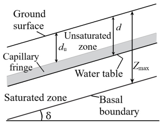 where Z is the vertical downward coordinate, t is the time, is the soil water content, is the pore pressure, is the hydraulic conductivity and is the ground slope surface. According to Srivastava and Yeh [56], Equation (1) can be linearized using the exponential soil water retention curve proposed by Gardner [55] described by the following equations: