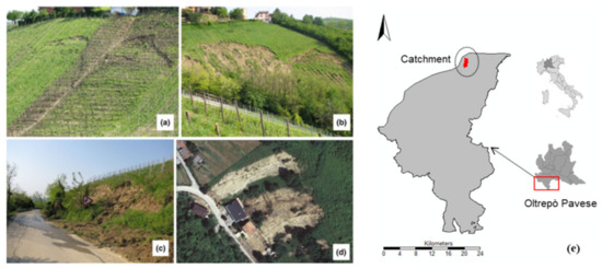 (a–d) Examples of landslide in the study area [70]; (e) catchment within Oltrepò Pavese region.